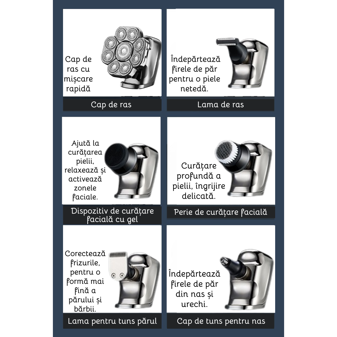 Aparat de ras electric 9D, Set Multifunctional 6 in 1, cu 9 lame rotative, Cap detasabil magnetic, Impermeabil, Barbierit uscat si umed, Afisaj LED, Reincarcabil USB, Pentru fata, Cap si Nas, FilSAB