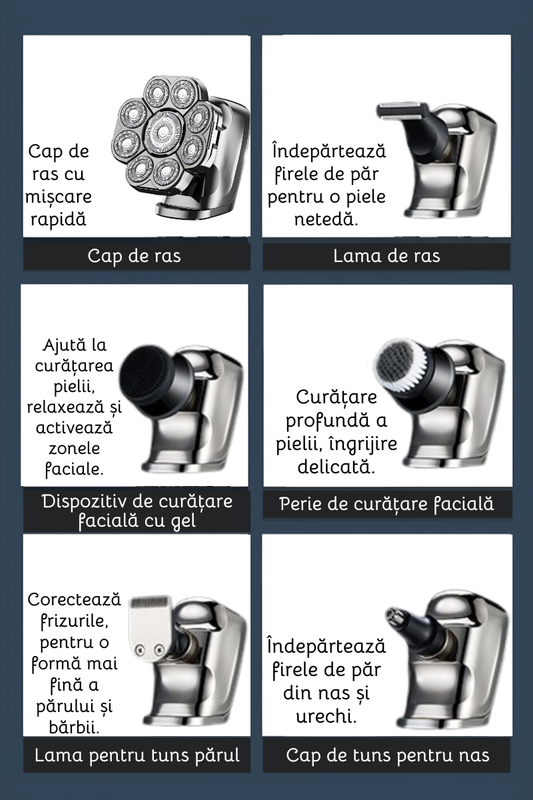 Transforma-ti rutina de ingrijire cu aparatul de ras electric 9D, dotat cu 9 capete rotative de mare precizie. Proiectat pentru barbierit complet, tuns, curatare faciala si modelare, acest aparat multifunctional este solutia all-in-one pentru un look ingrijit si profesional.