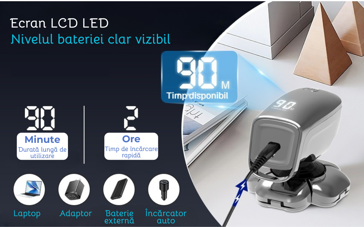 Bateria se incarca complet in doar 2 ore si iti ofera pana la 90 de minute de utilizare continua. Afisajul LED iti arata clar nivelul bateriei, astfel incat sa stii mereu cand este momentul sa il reincarci. Practic si modern, poate fi incarcat oriunde prin cablu USB.