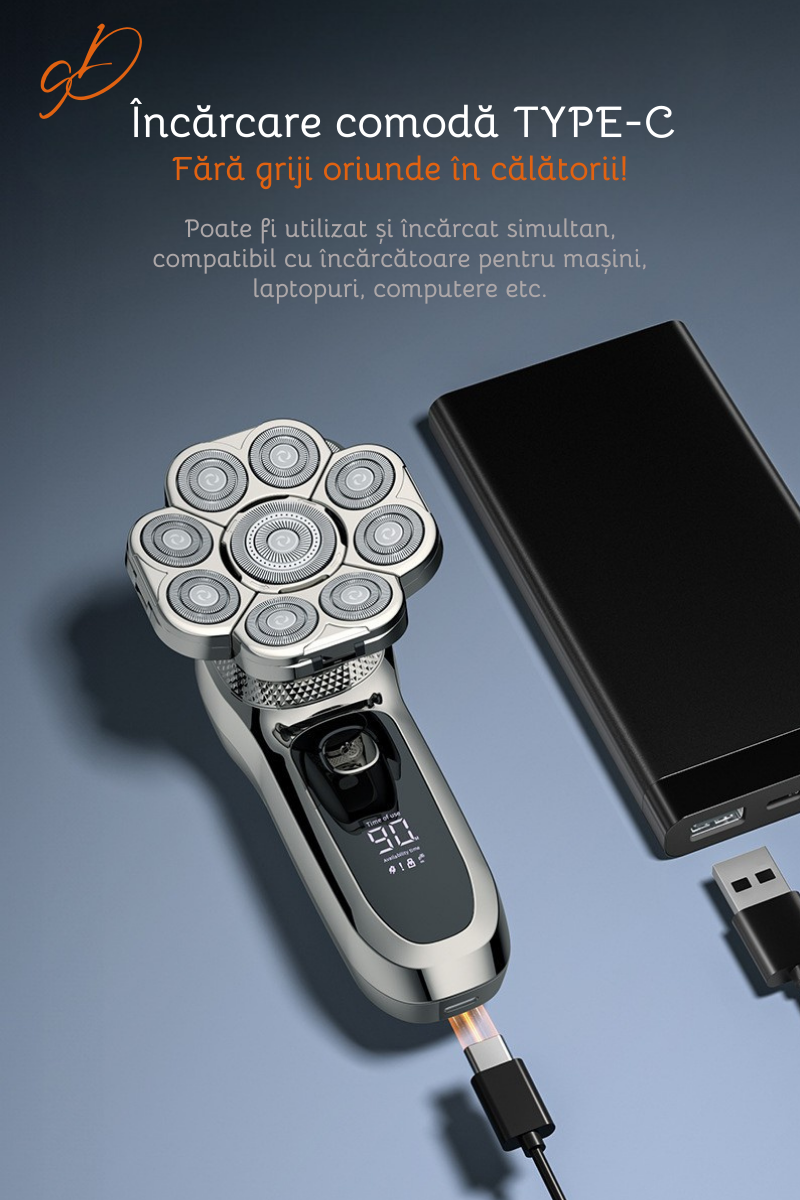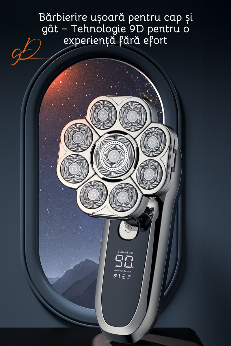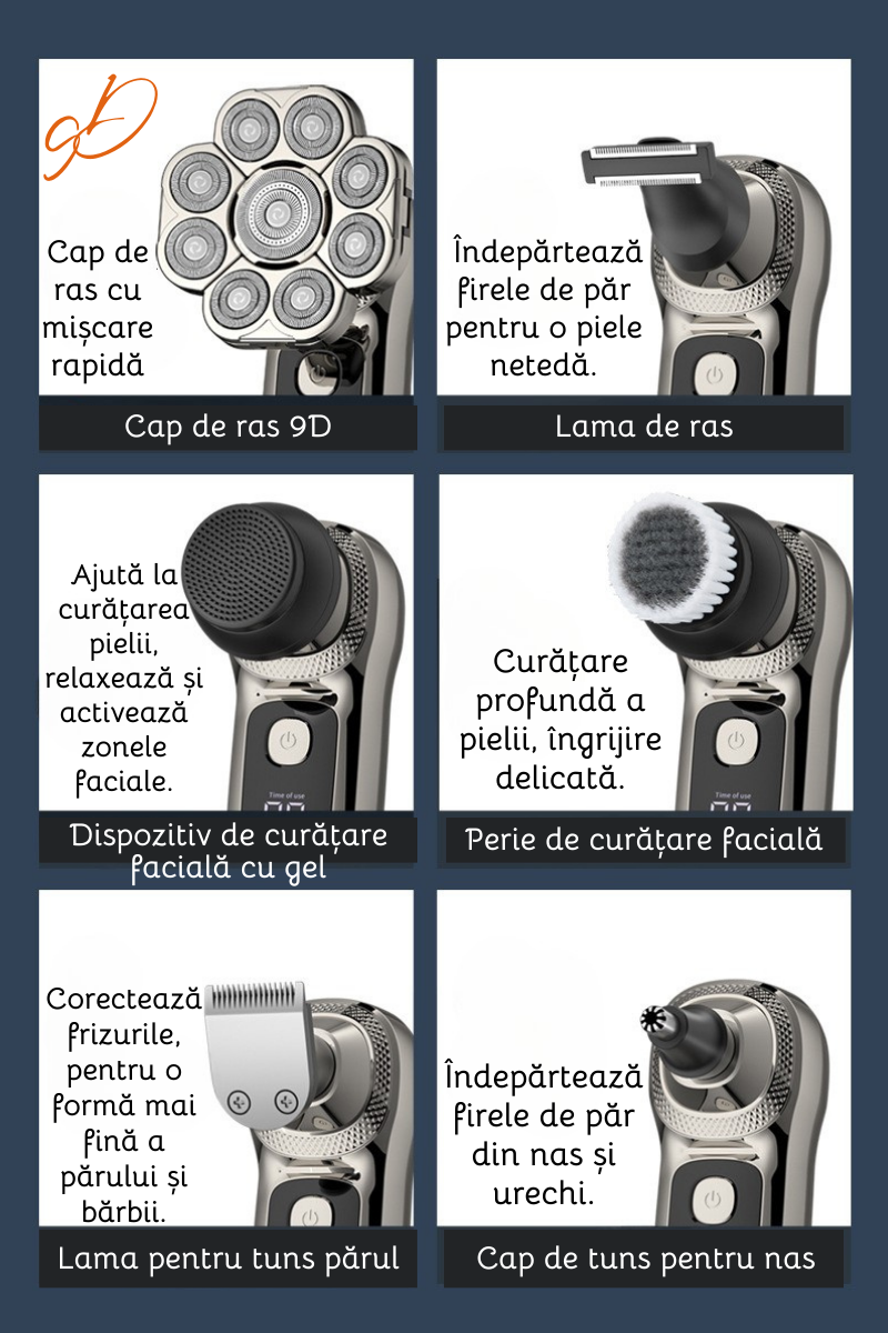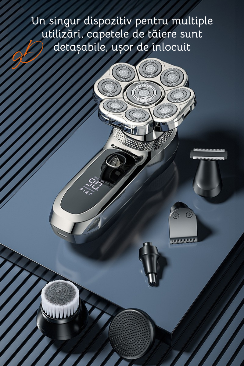 Aparat de ras electric Profesional, Set Multifunctional, Accesorii 6 in 1, 9 lame rotative, Cap detasabil magnetic, Impermeabil IPX6, Barbierit uscat si umed, Afisaj LED, Accesorii pentru Barba, Cap s