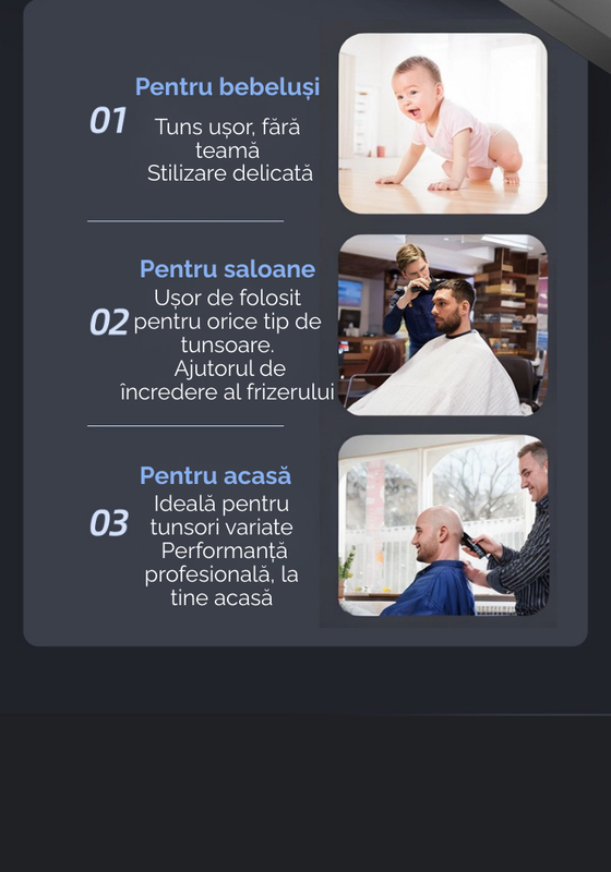 Masina de tuns fara fir pentru barbati ofera performanta de top si un design elegant, ideala atat pentru uzcasnic, cat si profesional. Echipata cu un motor puternic 7200 RPM, ofera taieturi uniforme chiar si pentru parul gros sau des.