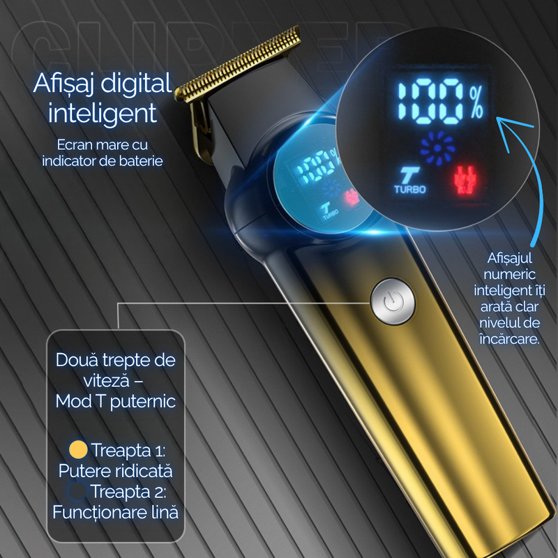 Echipata cu lame din aliaj de titan, masina ofera o taiere fina si precisa, rezistenta la uzura si coroziune. Afisajul digital LCD inteligent permite monitorizarea in timp real a nivelului de incarcare si a modului de functionare. Cele doua trepte de viteza – modul Turbo si modul Soft – ofera control deplin asupra procesului de tuns, in functie de nevoi.