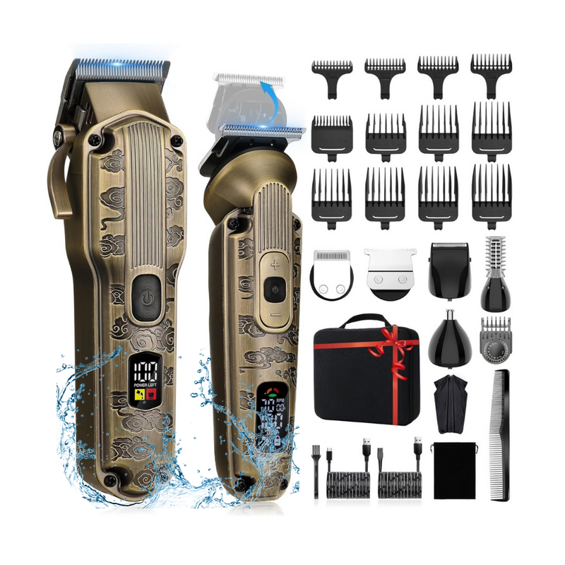 Acest set complet pentru barbati include o masina de tuns fara fir echipata cu un motor puternic si lame din otel inoxidabil, un trimmer de precizie - ideal atat pentru frizeri profesionisti, cat si pentru utilizarea acasa. Designul ergonomic si greutatea redusa faciliteaza manevrarea, iar accesoriile multiple permit adaptarea pentru diferite stiluri si lungimi de par. Carcasa metalica eleganta cu gravura vintage ofera un aspect premium, fiind si o idee excelenta de cadou.