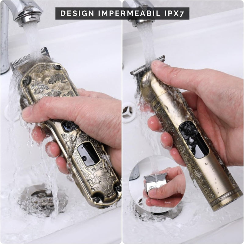 Masina de tuns si aparat de ras, profesionala, trimmer cu lama T pentru par/barba/par corporal/nas, cu acumulator, afisaj LED, set, rezistent la apa, retro, auriu