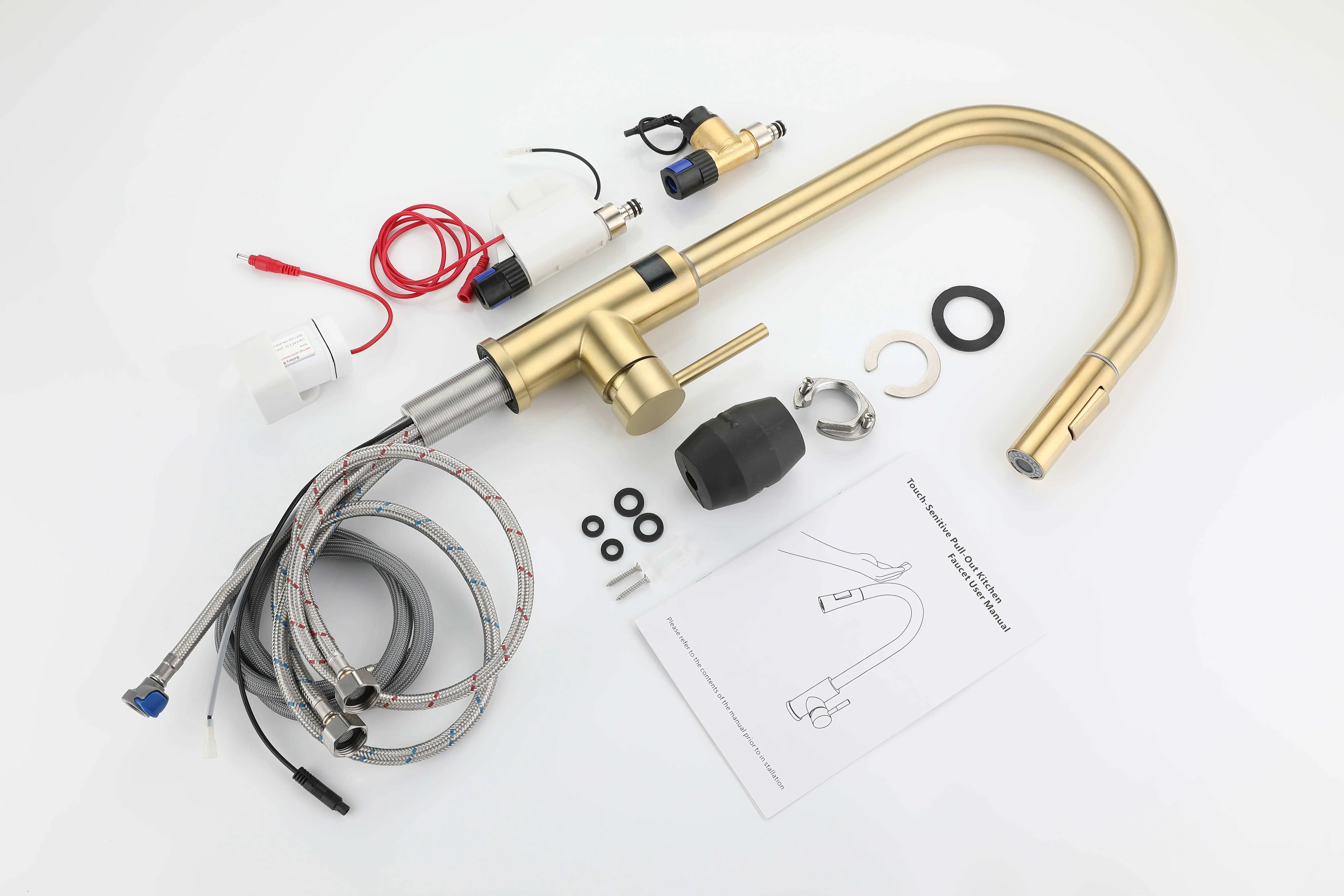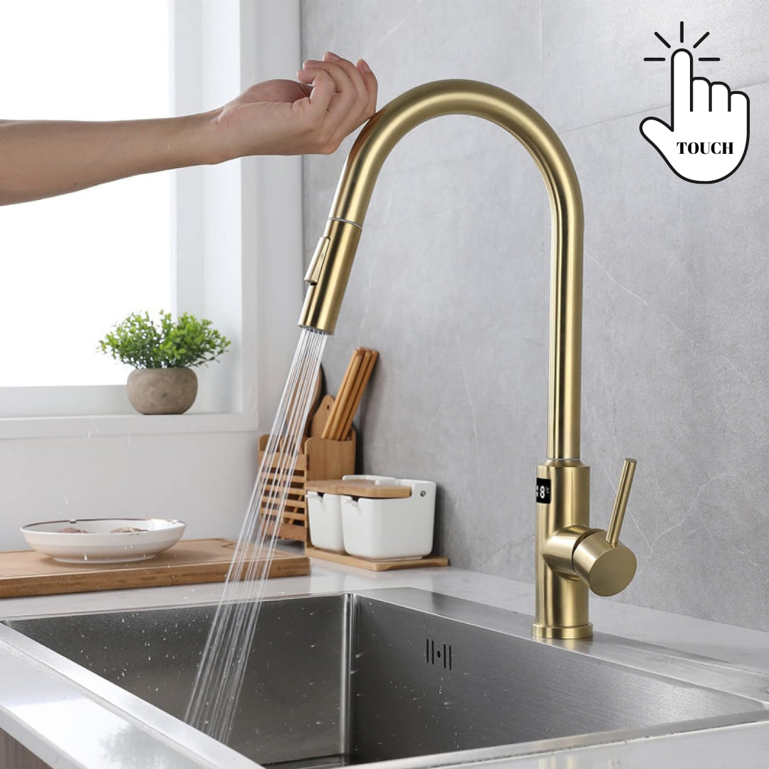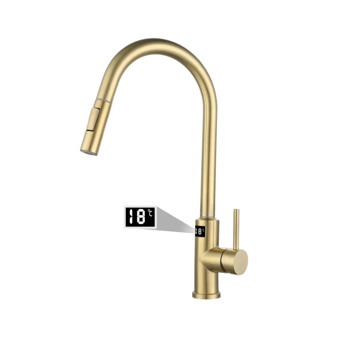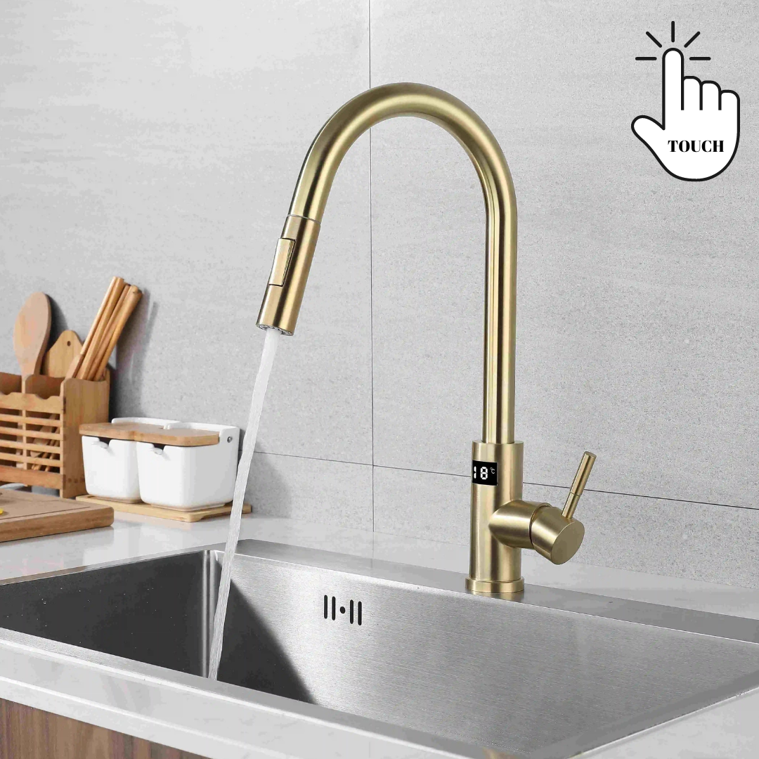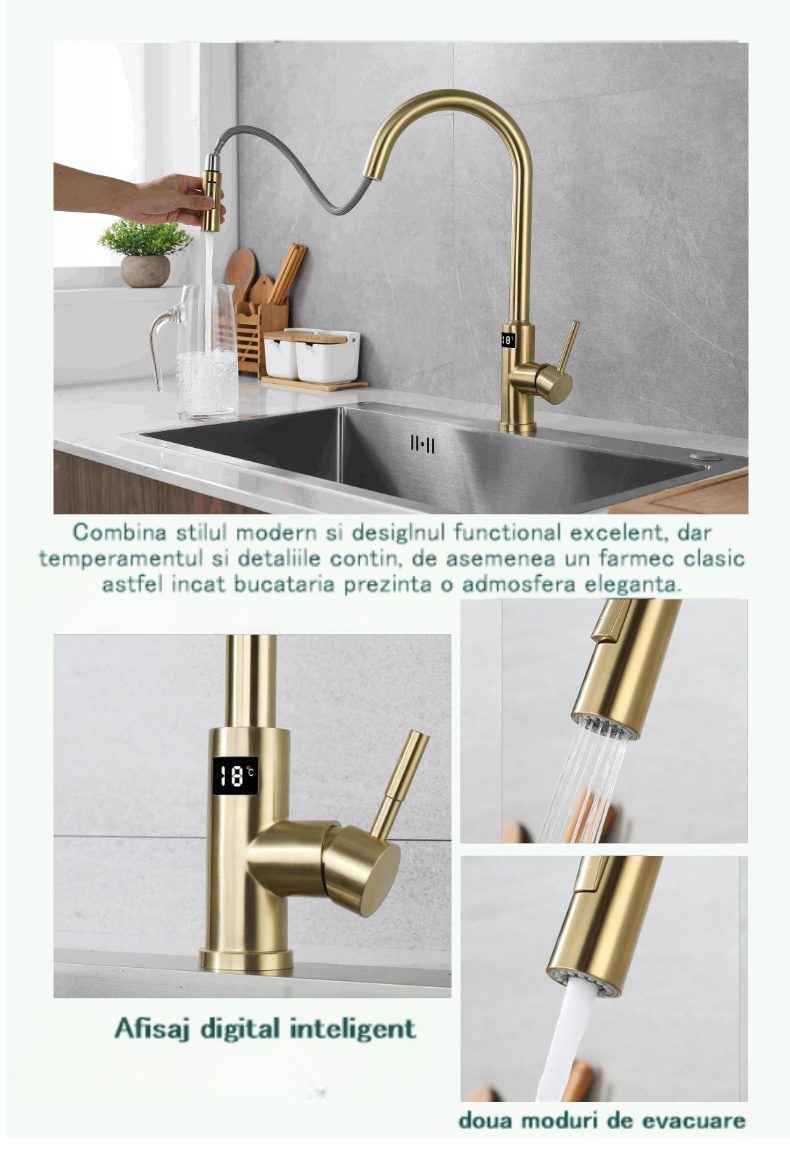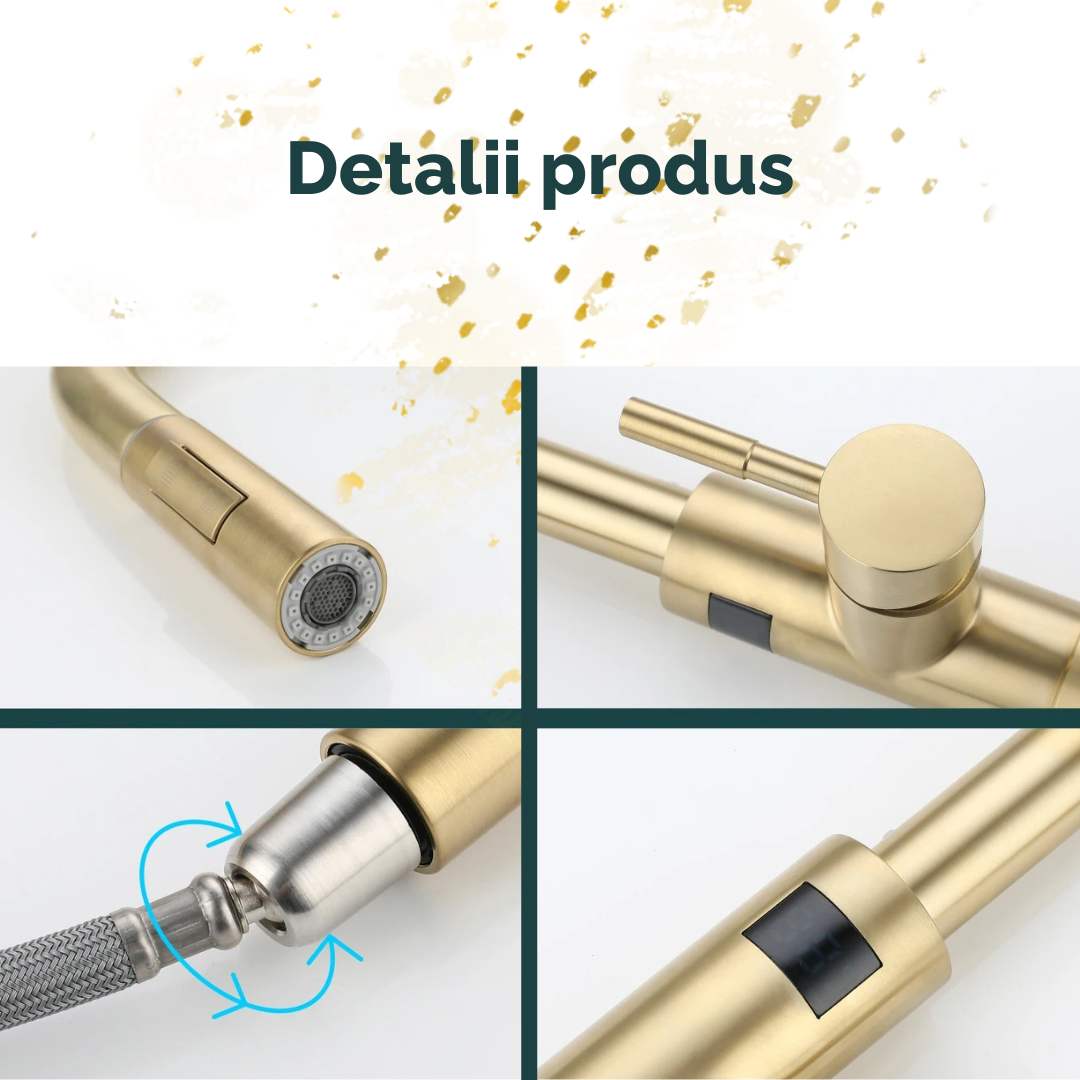 Baterie Bucatarie Aurie, Profesionala, Afisaj Digital LED Temperatura, Senzor de Pornire la Atingere (touch control), Rotire 360°, Dus Extractibil si Pipa Pivotanta, 2 Functii de Curgere a Apei, Silen