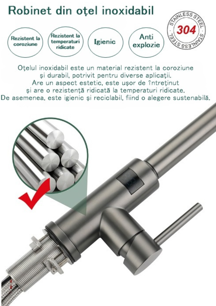 Cu un design contemporan, aceasta baterie de bucatarie adauga o nota de rafinament si sofisticare in orice spatiu de bucatarie. Cu o singura gaura de instalare, aceasta se monteaza cu usurinta pe punte si se integreaza perfect in orice decor.