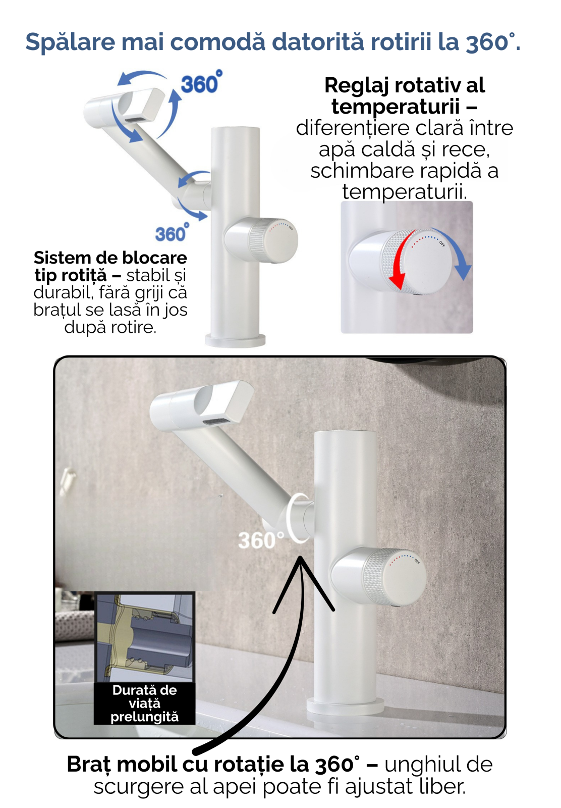 Gatul bateriei se roteste complet, oferindu-ti libertate deplina de miscare si un plus de confort la spalarea mainilor sau a fetei. Perfect pentru chiuvete de dimensiuni mari sau duble.