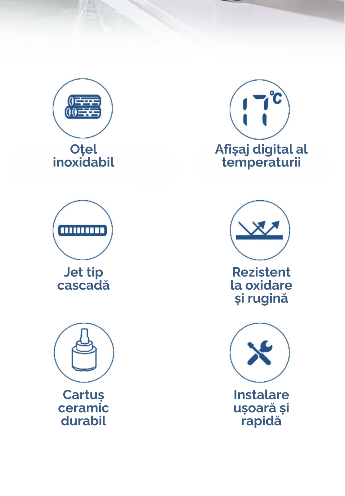 Spune adio testelor cu mana sub jet. Cu afisajul digital LED integrat, temperatura apei este vizibila in permanenta, oferind siguranta sporita si confort. Ideal pentru copii si varstnici.
