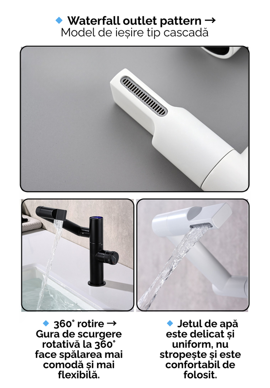 Designul special al gurii de scurgere creeaza un jet de apa tip cascada, elegant si linistit, care nu stropeste si adauga o nota de rafinament oricarei chiuvete. Este silentios si contribuie la o experienta mai placuta in fiecare utilizare.